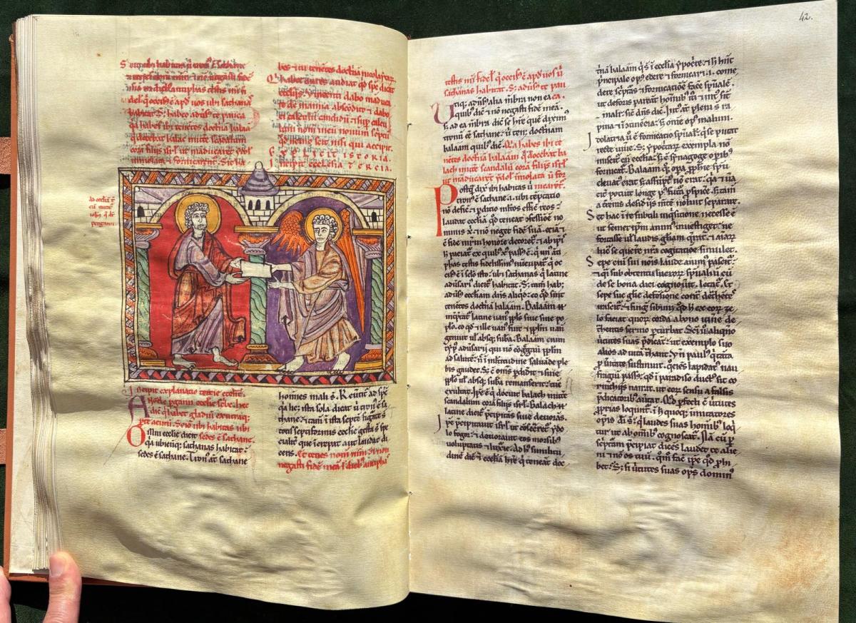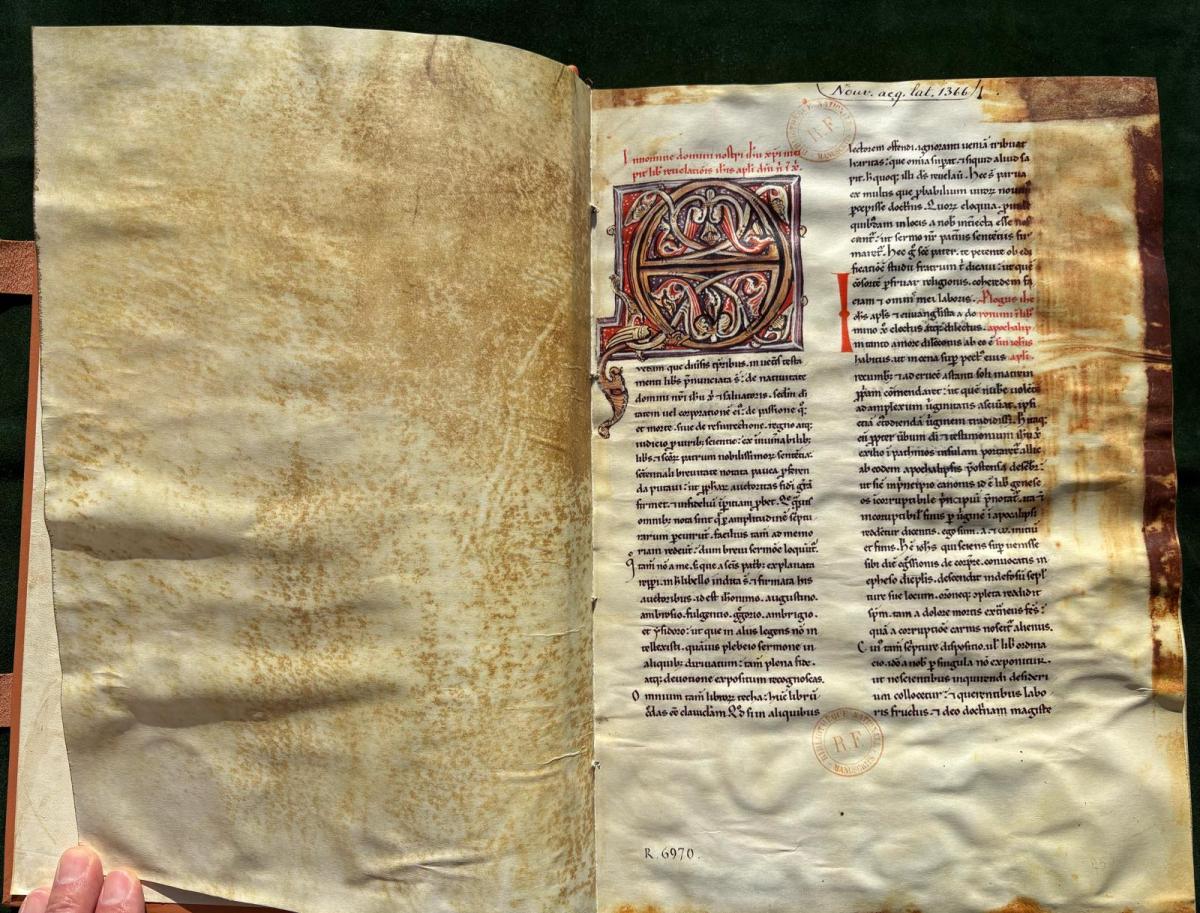 La primera descripción que hizo Leopold Delisle del documento era muy directa sobre su procedencia: L'écriture, qui est disposée sur deux colonnes, peut être rapportée à la fin du XIIe siècle; elle ne diffère pas sensiblement des meilleur types adoptés à cette époque par les calligraplies français; mais remploi alternatif du rouge et du violet pour les initiales et le style des peintures nous indiquent suffisammenl que c'est un travail espagnol. La escritura, dispuesta en dos columnas, puede datarse a finales del siglo XII; no difiere significativamente de los mejores tipos adoptados en aquella época por la caligrafía francesa; pero el uso alternado del rojo y el púrpura para las iniciales y el estilo de las pinturas nos indican suficientemente que se trata de una obra española.