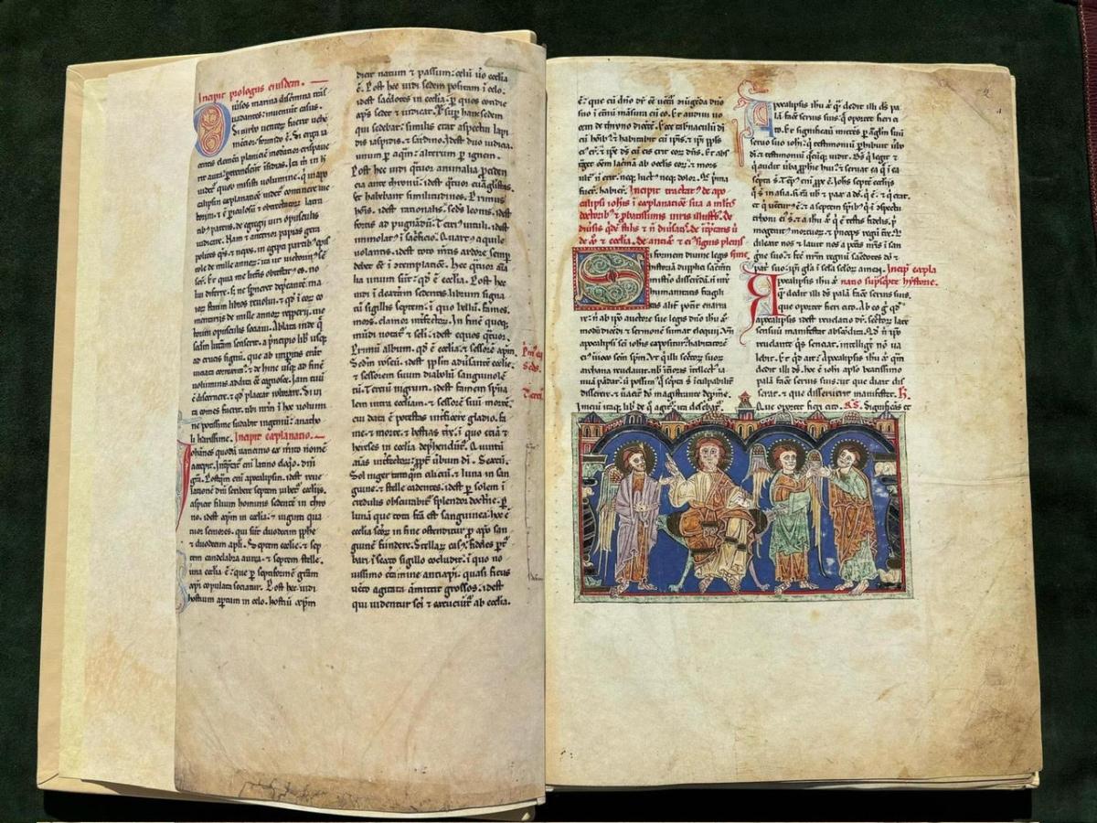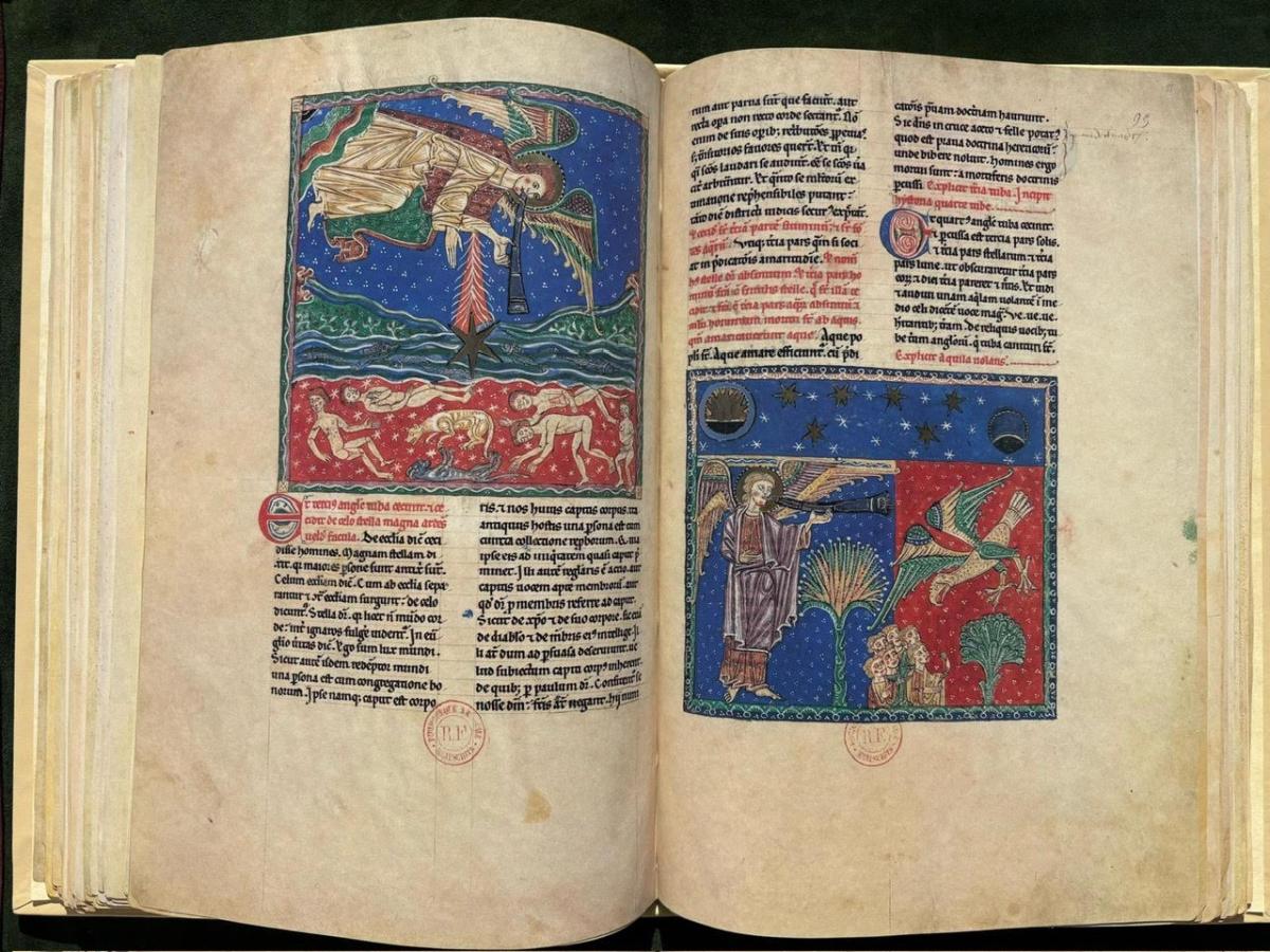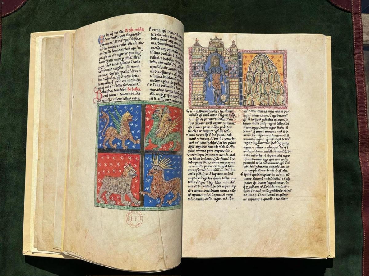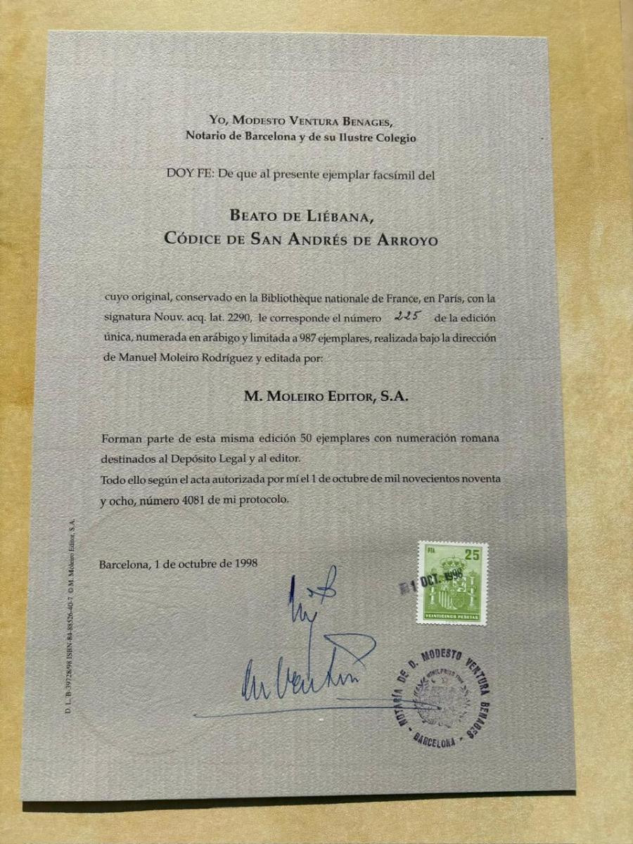 Facsímil y libro de estudio Ejemplar 225 de la edición de 987 El Beato de Arroyo, o Beato de San Andrés de Arroyo, es un manuscrito iluminado que contiene el comentario en el Apocalipsis de Beat de Liébana. Fue producido en la primera mitad del XIII (verso 1220), quizás en San Pedro de Cardeña, para el monasterio femenino de San Andrés de Arroyo. Se conserva en la Biblioteca Nacional de Francia en París con la signatura Nouv. Acq. Lat. 2290. Consta de 166 folios en pergamino, escritos en dos columnas. Los folios miden 440 × 305 mm. Contiene 69 ilustraciones, de las cuales una docena en página entera y un cierto número que ocupan medio o dos tercios del folio. Una de las miniaturas notables es el mapamundi a doble folio (13v-14r).El beato está producido con gran lujo, con oro y plata y miniaturas donde domina el azul lapislázuli. Junto al Beato de Las Huelgas, es de los pocos destinados a un monasterio femenino y uno de los más tardíos, lo que se pone de manifiesto en las miniaturas de estilo ya plenamente románico.