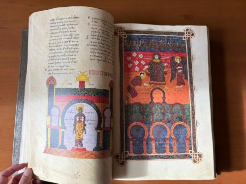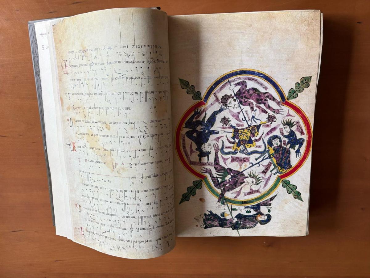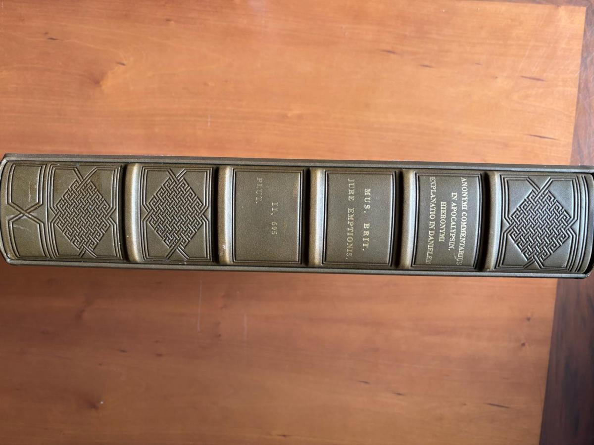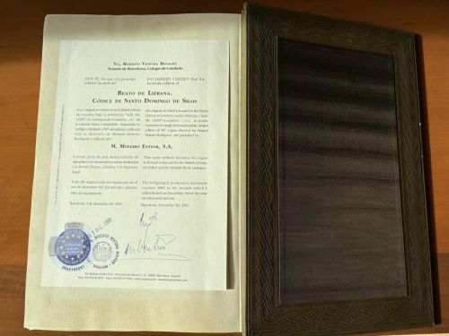 Facsímil. El Beato de Liébana, Códice de Santo Domingo de Silos (Add. MS 11695), es una obra maestra iluminada del siglo XI (finalizado c. 1091-1109) realizada en el scriptorium de Silos, Burgos. Destaca por sus 106 miniaturas de estilo mozárabe con influencias románicas, uso intenso de oro y colores vibrantes. Se conserva en la Biblioteca Británica. Contenido: Comentarios al Apocalipsis de San Juan y al Libro de Daniel, incluyendo una inusual visión del Infierno y un mapamundi. Estilo: Considerado de la "Familia IIa", fusiona la tradición mozárabe (arcos de herradura) con influencias románicas, destacando por la calidad de sus miniaturas y el uso de oro y plata. Manuscrito: Escrito en letra visigótica a doble columna, consta de 560 páginas.