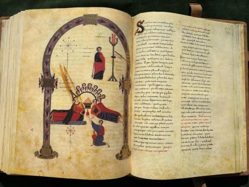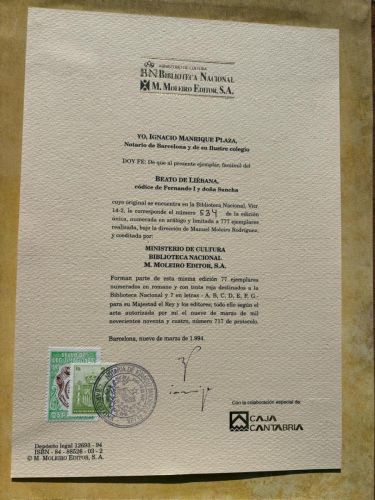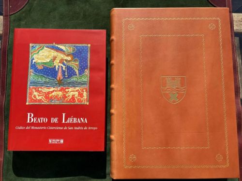 Facsímil y libro de estudio Ejemplar 534 de la edición de 777. Beato de Liébana (Liébana, c. 730-Liébana, c. 798), también llamado san Beato, fue un monje del monasterio de San Martín de Turieno (actualmente, Santo Toribio de LiébEl Beato de Fernando I y doña Sancha (vitrina 14-2 de la Biblioteca Nacional de España), es un manuscrito iluminado de mediados del siglo XI se llama así por el nombre del donante, Fernando I de León, aunque también se le denomina Beato de Facundo por el nombre del copista, Beato de San Isidoro de León por ser la Basílica de San Isidoro de León el lugar donde se encontraba originalmente o Segundo Beato de la Biblioteca Nacional por ser la Biblioteca Nacional de España en Madrid el lugar donde se conserva actualmente con la referencia Vit. 14-2.El Beato de Fernando I que contiene el Comentario al Apocalipsis de Beato de Liébana, encuadernado en piel consta de 312 folios en pergamino (624 páginas a 2 columnas) con 35 líneas de escritura visigótica e ilustrado con 98 miniaturas.