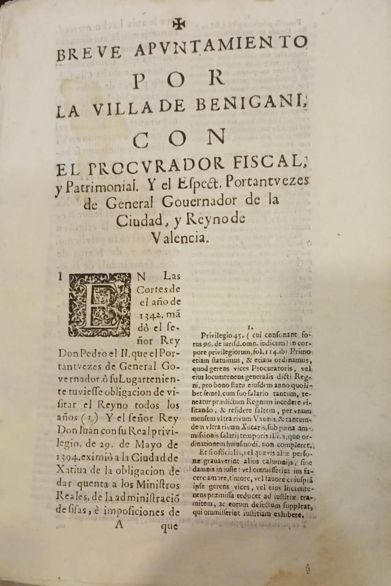 Breve apuntamiento por la villa de Benigani CON el procurador fiscal sobre el privilegio concedido a Jativa en 1394 del cual se beneficiaba también Benigani, privilegios refrendados en 1602 por Felipe iI que les eximían de la obligacion de dar cuent a los Ministros reales de la administración de sisas e imposiciones...