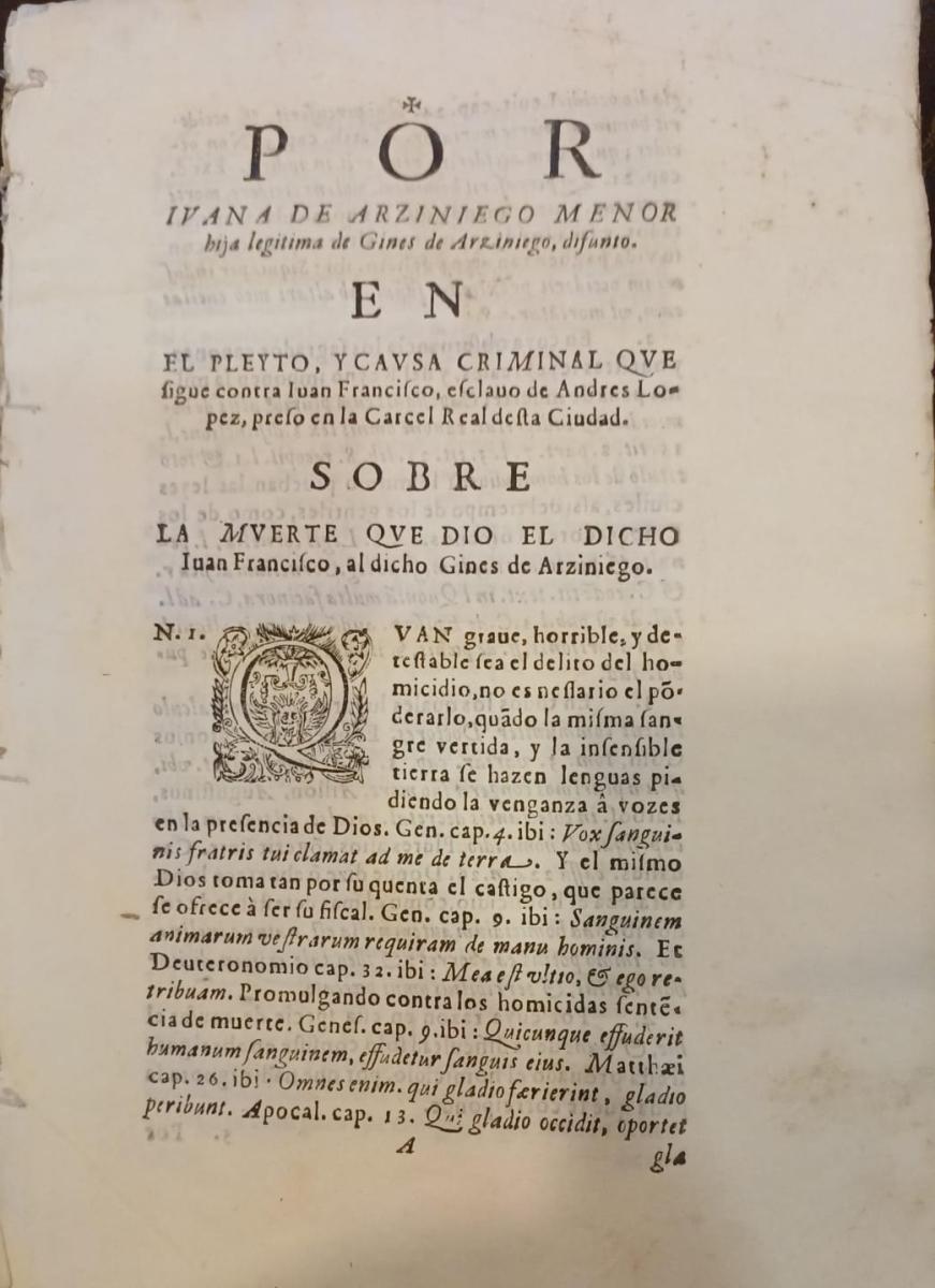 El esclavo Juan Francisco asesina a Gines de Arziniego en el lugar de Los Algezares de Murcia - POR Juana de Arziniego en el pleyto y causa criminal que sigue contra Juan Fransico, esclavo de Andrés López preso en la Cárcel Real de esta ciudad SOBRE la muerte que dio el dicho Juan Francisco al dicho Gines