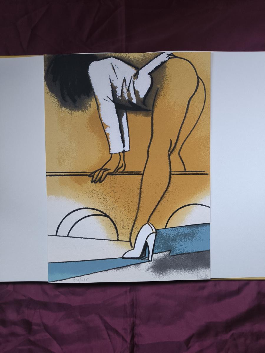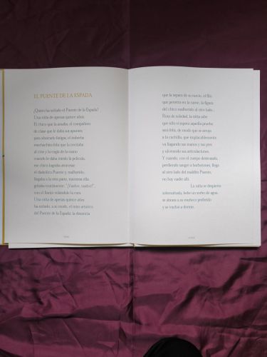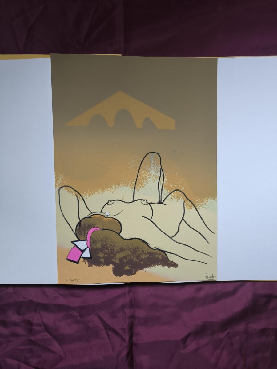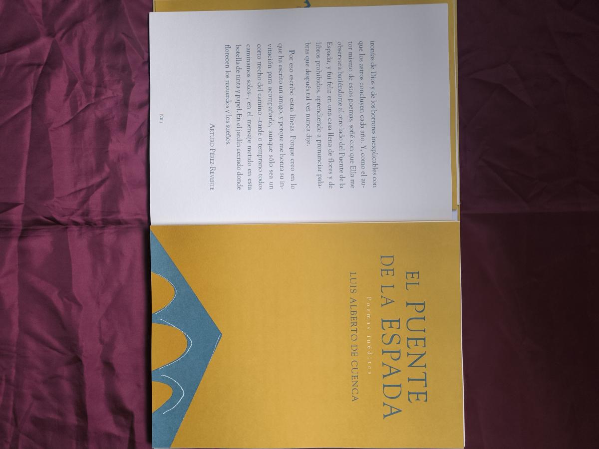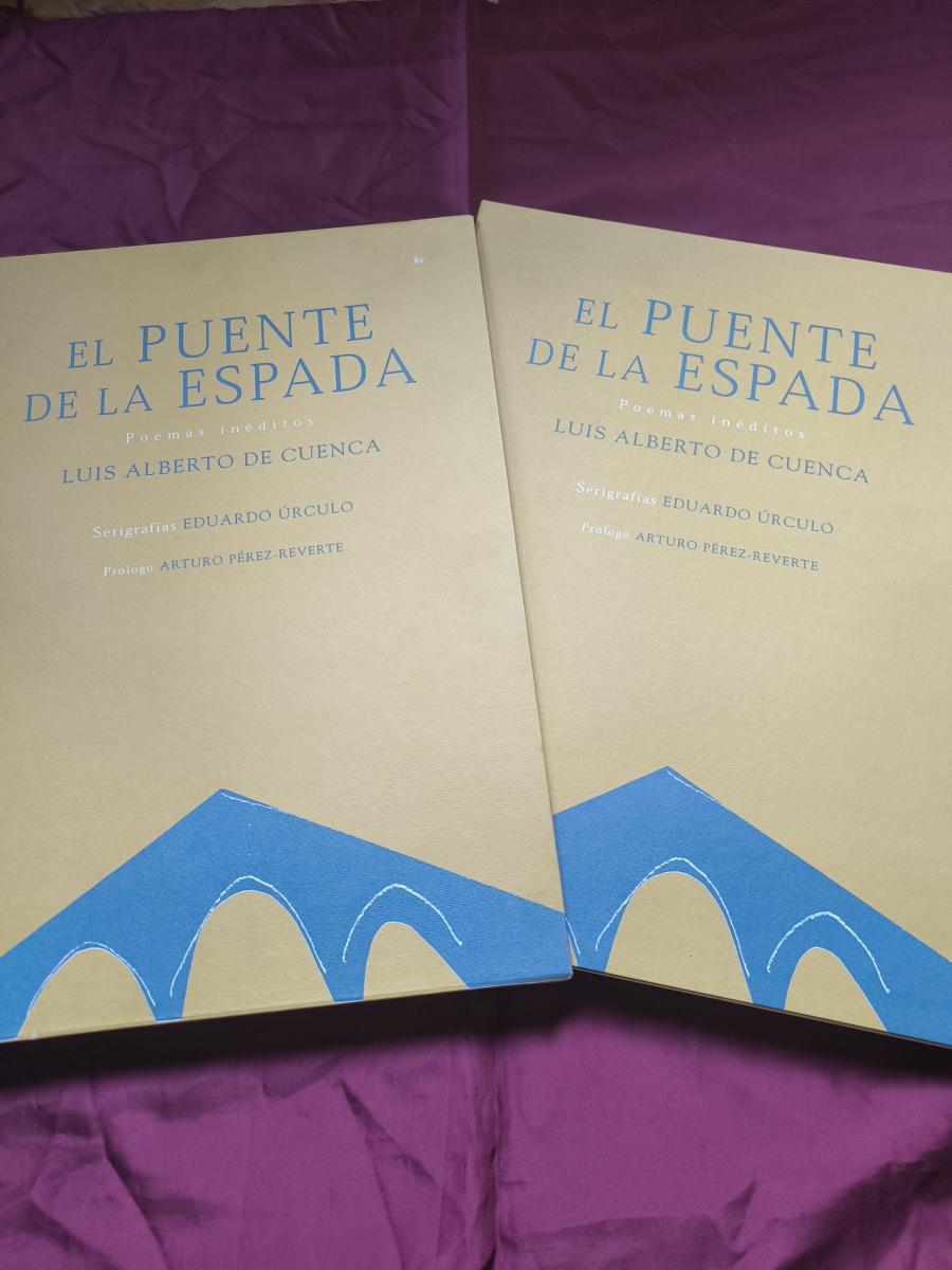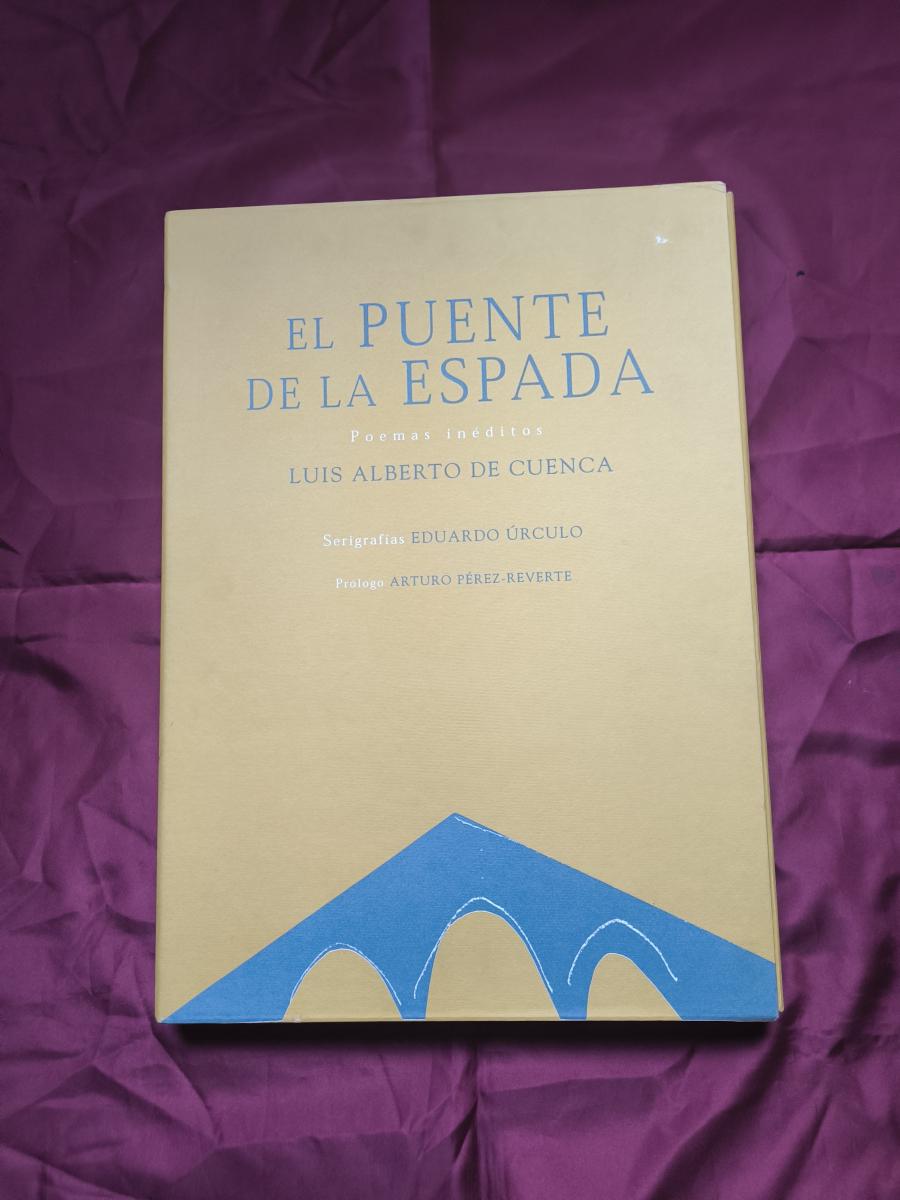 Facsímil ejmplar 276. El puente de la espada es un libro de artista que reúne poemas inéditos de Luis Alberto de Cuenca acompañados por seis serigrafías originales de Eduardo Úrculo, todas firmadas a mano a lápiz por el artista y numeradas por el editor. La edición, publicada en 2002 por la editorial Ahora (Murcia), está prologada por Arturo Pérez‑Reverte y presentada por Ángel Pina Ruiz, subrayando el carácter de proyecto de bibliofilia colectiva entre escritor, pintor y editor. Se trata de un volumen de gran formato (en torno a 32 × 45 cm), impreso en papel de alta calidad y con doble cubierta, concebido expresamente como libro de bibliofilia de tirada corta y numerada. La tirada se distribuye en: 6 ejemplares para Depósito Legal (1–6), 295 ejemplares a la venta numerados del 1 al 295, 12 ejemplares para colaboradores (A–L), 15 pruebas de autor (1–15) y 70 ejemplares en números romanos (I–LXX), todos con las seis serigrafías originales numeradas y firmadas. En los poemas, Cuenca despliega su poesía de inspiración clásica y mitológica (caballería, héroes, búsqueda del ideal, pérdida), mientras que Úrculo aporta imágenes de fuerte sensualidad, movimiento y melancolía, sin relación ilustrativa literal, sino en diálogo simbólico con los textos. Por la relevancia de los tres nombres implicados (Cuenca, Úrculo, Pérez‑Reverte), la calidad de la impresión y la escasez de ejemplares en el mercado, la obra se considera hoy una pieza codiciada dentro del coleccionismo de libro de artista y arte gráfico contemporáneo español.