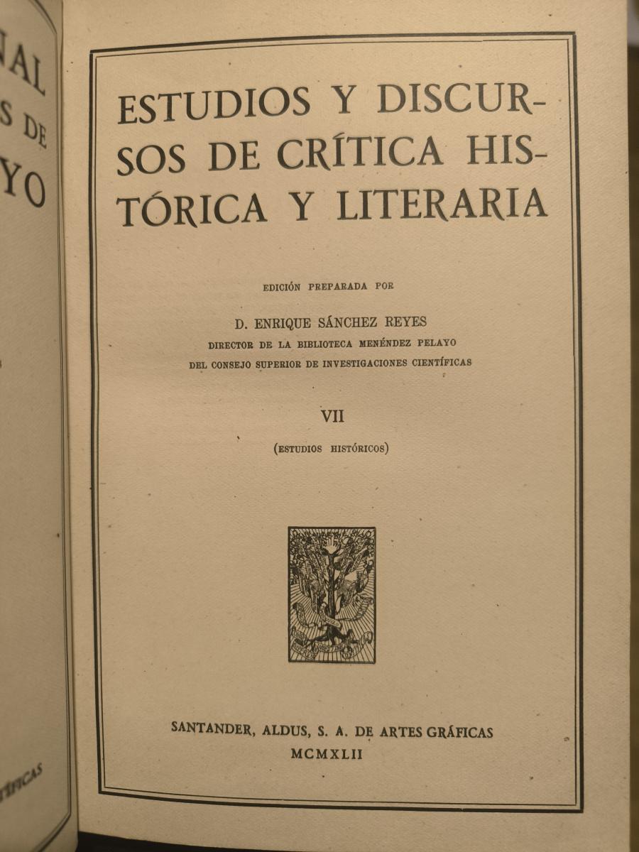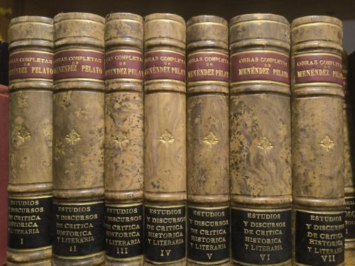 Aldus, Santander, 1941. 7 vols. Edición nacional de las obras completas de Menéndez Pelayo. semi-piel con dos tejuelos, nervios y rueda. 420, 405, 388, 395, 418, 444 y 388. 14x21