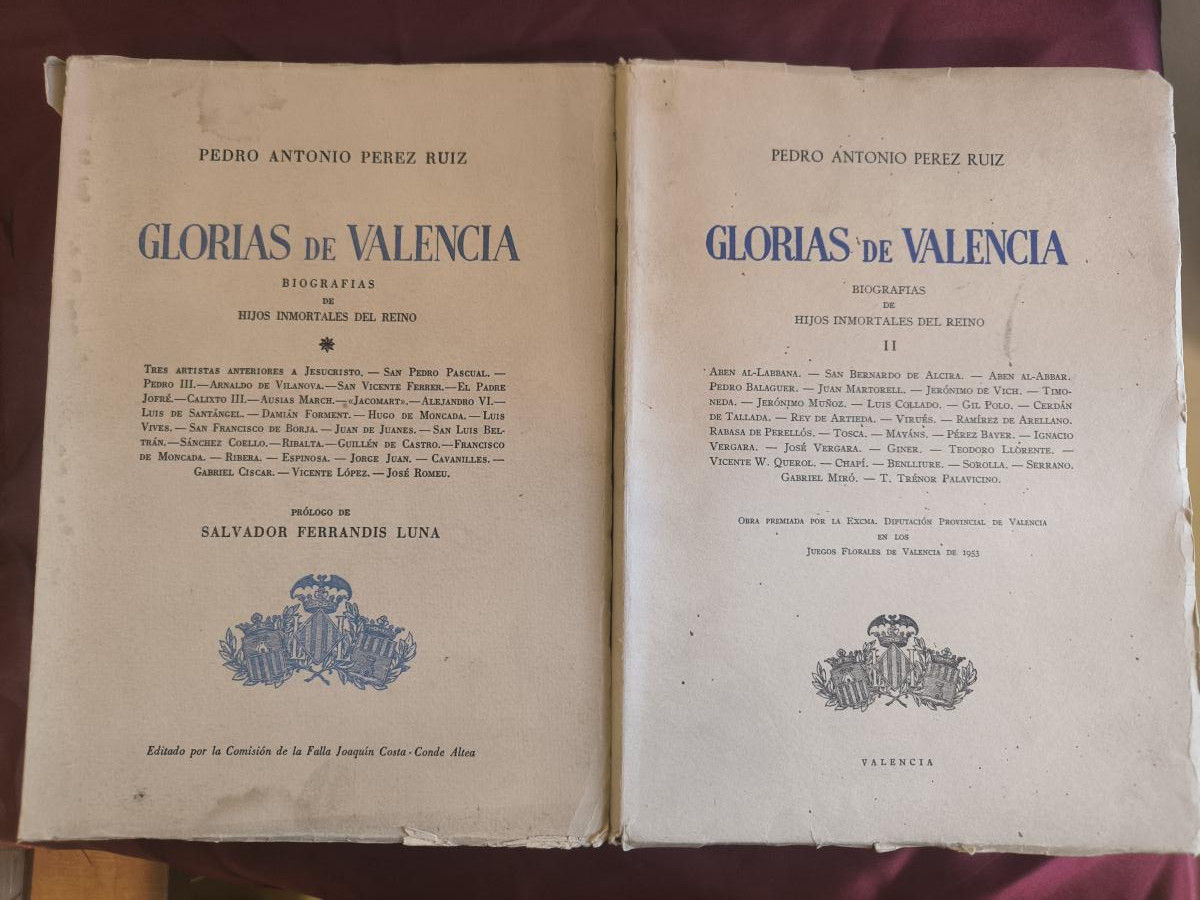Comisión de la Falla Joaquín Costa - Conde Altea, Valencia, 1.953. 2 vols. Pról. de Salvador Ferrandis Luna. Buen papel y márgenes. Ilustrado con retratos de los personajes biografiados, 30 en el vol. I y 29 en el II. Manchas de agua en los cortes, sin afectar al interior del libro. 335 y 378 págs., 25x18. Disponemos también del Tomo I suelto, con pérdida de pequeños trozos de la ceja externa de la cubierta superior, al precio de 4.000