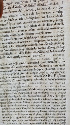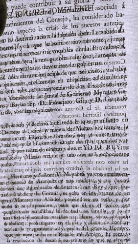 Impreso en Madrid 8 de mayo de 1808 enviado a los Justicias y los Pueblos de orden de Carlos IV donde con razones muy curiosas y enrevesadas protesta de su abdicación considerándola nula y para ello adjunta copias de varios documentos: 1. Protesta de Carlos IV a la abdicación en Aranjuez a 21 de marzo de 1808. 2. Carta de Carlos IV a Napoleón repleta de adulaciones remitiéndole la protesta. 3. Reiteración de la protesta dirigida al Infante D. Antonio, confirmando en sus puestos a la Junta de Gobierno y comunicándole que piensa salir al encuentro de Napoleón en San Lorenzo, abril de 1808. 4. Carta de Napoleón a Fernan VII en que solamente lo reconoce como Príncipe de Asturias y deja traslucir sus designios diciendo que no puede reconocer la abdicación de Carlos IV estando España ocupada por sus tropas... pero le da a entender que él procurará conciliarlo todo para incitarlo a una entrevista en Bayona, donde consiguió apoderarse de toda la Familia Real. Bayona, 4 de mayo de 1808. 5. Indigna carta de Carlos IV a Murat nombrándolo lugarteniente del Reino, Bayona, 4 de mayo de 1808. 6. La Junta Suprema de gobierno nombra lugarteniente a Murat, Madrid, 7 de mayo de 1808. 7. Aceptación del nombramiento por Murat, Madrid, 15 de junio de 1808. 8. Documento de Murat autorizando para que se utilice su nombre como Lugarteniente en los nombramientos y órdenes, Madrid, 25 de mayo de 1808. 2 impresos diferentes con 5 folios en total y uno blanco