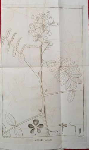 140 págs., 1 gran tabla desplegable, 20 láminas grabadas, tres de ellas desplegables. Portada oscurecida, pero las láminas están limpias. Sin encuadernación, cubiertas en papel de aguas. Primera edición de este estudio dedicada a Augustin Pryamus de Candolle. Es uno de los primeros estudios científicos sobre la planta leguminosa, Cassia. Las láminas, grabadas por Moquin, ilustran diferentes plantas de este género. 4º mayor
