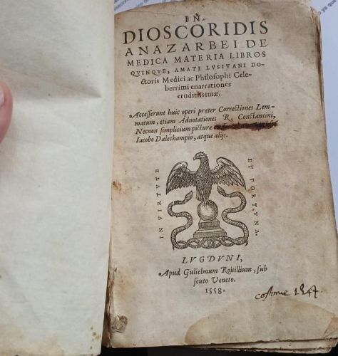 In Dioscoridis Anazarbei de medica materia libros quinque, Amati Lusitani doctoris… Acceserunt huic aperi correctiones lemmatum, etiam adnotationes R. Constantini, necnon simplicium pintura … Iacobo Dalechampio, atque aliis