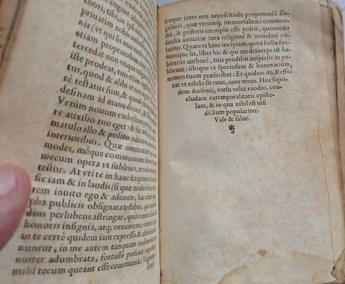 La cubierta superior y los primeros cuadernillos están desprendidos del cuerpo del libro y la hoja paginada 451-451 está semi-desprendida y sufre faltas de papel en los márgenes aunque sin afectar al texto. La hoja siguiente tiene dos pequeñas rasgaduras, a la 771-772 le falta la esquina superior afectando ligeramente al texto y en las hojas finales un pequeño punto de xilófago en el margen superior que no afecta al texto.