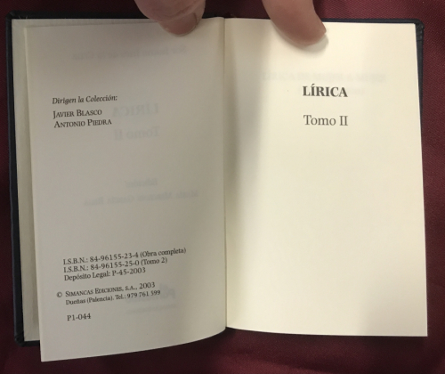 Simancas, 2003. Lírica. Guaflex editorial, 16º. 2 volúmenes. Tomo I.- 106 pp. Tomo II.- 110 pp.