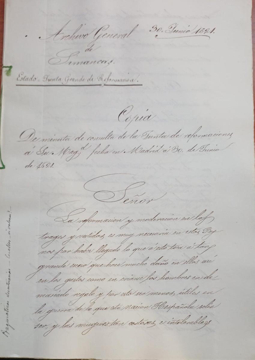 (Manuscrito) Copia de época de minuta de la Junta de Reformación de costumbres y vicios sobre el uso excesivo de cuellos grandes (valones) y las pragmáticas suntuarias