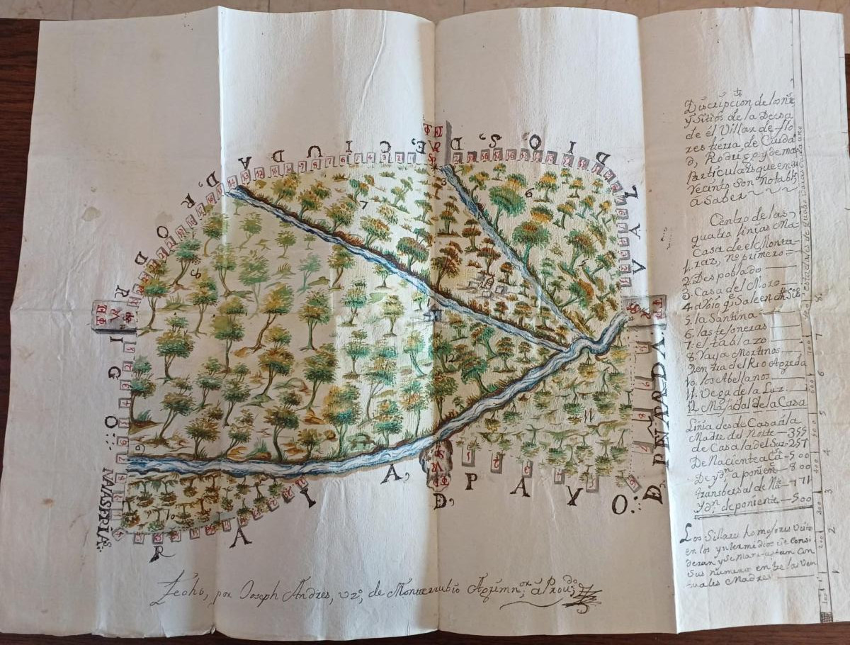 Hecho por Joseph Andres, vecino de Monterrubio, agrimensor. Plano a todo color de época con indicación al margen de las medidas en estadales, amojonamientos y lugares señalados con números. Sin fecha pero s. XVIII. 61x42 cms., plegado. Buen papel y perfec