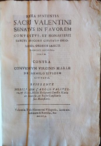 Un impreso de 2 folios con su propia portada, Valencia, Jerónimo Villagrasa, 1674 junto con 12 documentos manuscritos, algunos en lengua valenciana, compuestos por 6, 12, 8, 4, 6, 2, 2, 4, 5, 4, 4 y 5 folios