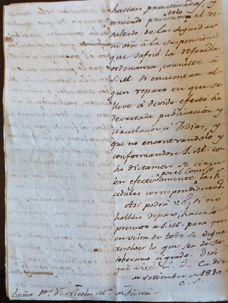 Cádiz, 1810. Dirigido al Excmo. Sr. D. Nicolás María Sierra del Supremo Consejo de Indias. 14 hojas en 4º manuscritas y firmadas C.S.