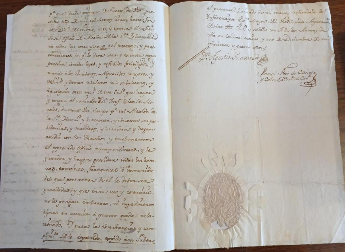 (Manuscrito) Nombramiento de Alcalde de la Santa Hermandad de Córdoba a favor de D. José Díaz de Morales por D. Agustín Guajardo Fajardo y Contreras, Corregidor de Córdoba.