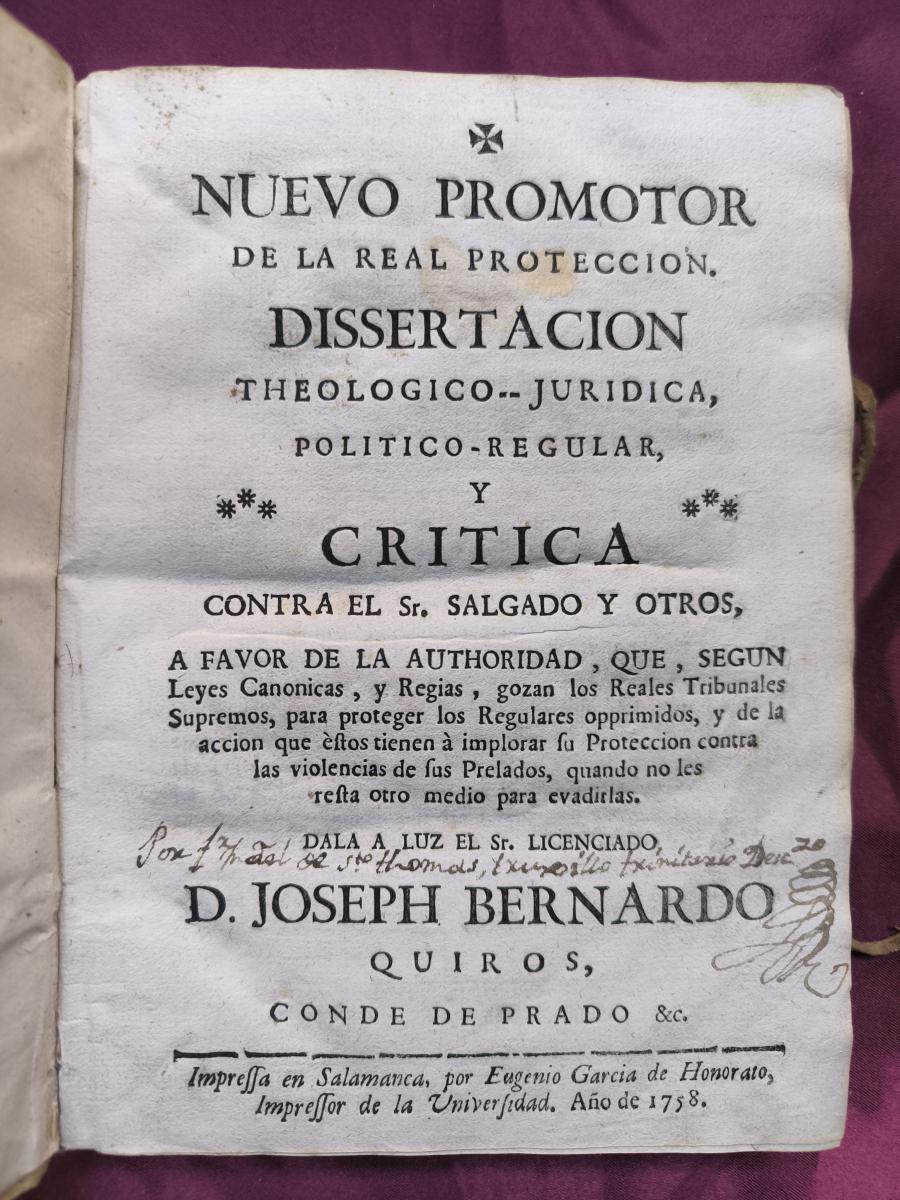 Nuevo promotor de la Real protección. Dissertación theologico-jurídica, político-regular y crítica contra el Sr. Salgado y otros a favor de la authoridad que, según leyes Canónicas y Reglas, gozan los Reales Tribunales Supremos, para proteger los Regulares opprimidos, y de la acción que estos tienen a implorar su Protección contra las violencias de sus prelados.