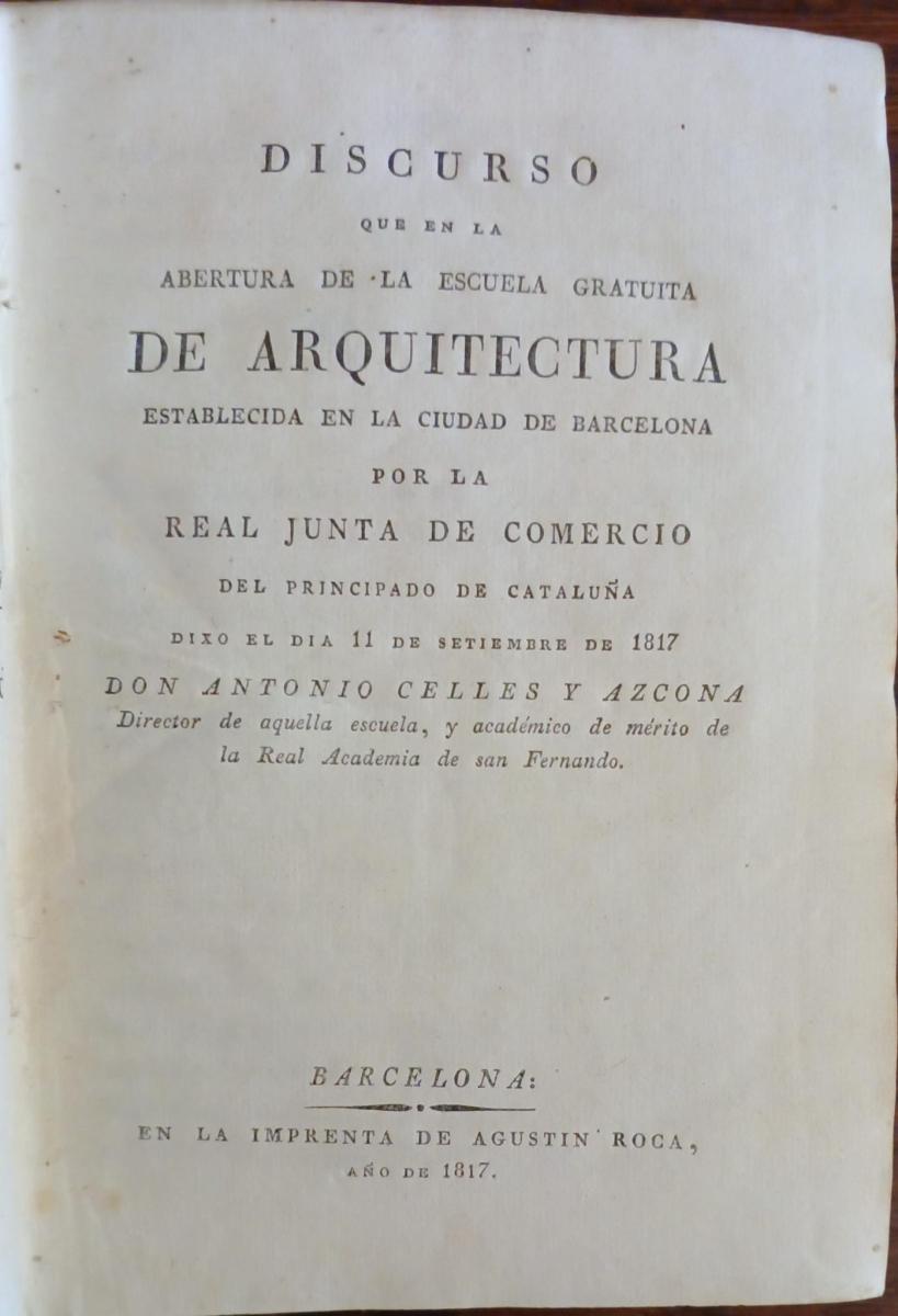 Papeles varios 1817-1822 - Discurso que en la abertura de la escuela gratuita de arquitectura establecida en la ciudad de Barcelona por la Real Junta de Comercio..., Agustín Roca, Barcelona, 1817, 35 págs., sigue...