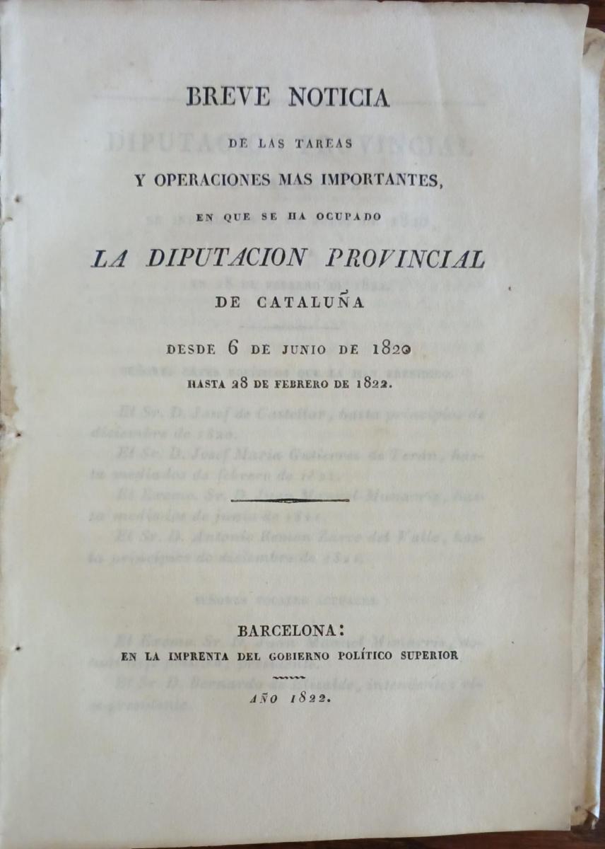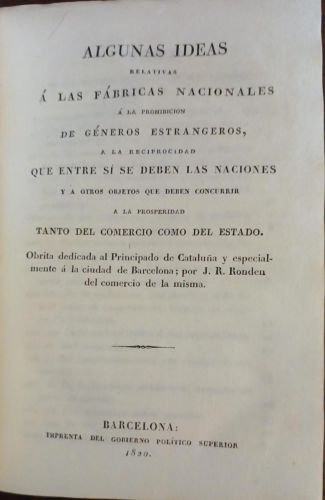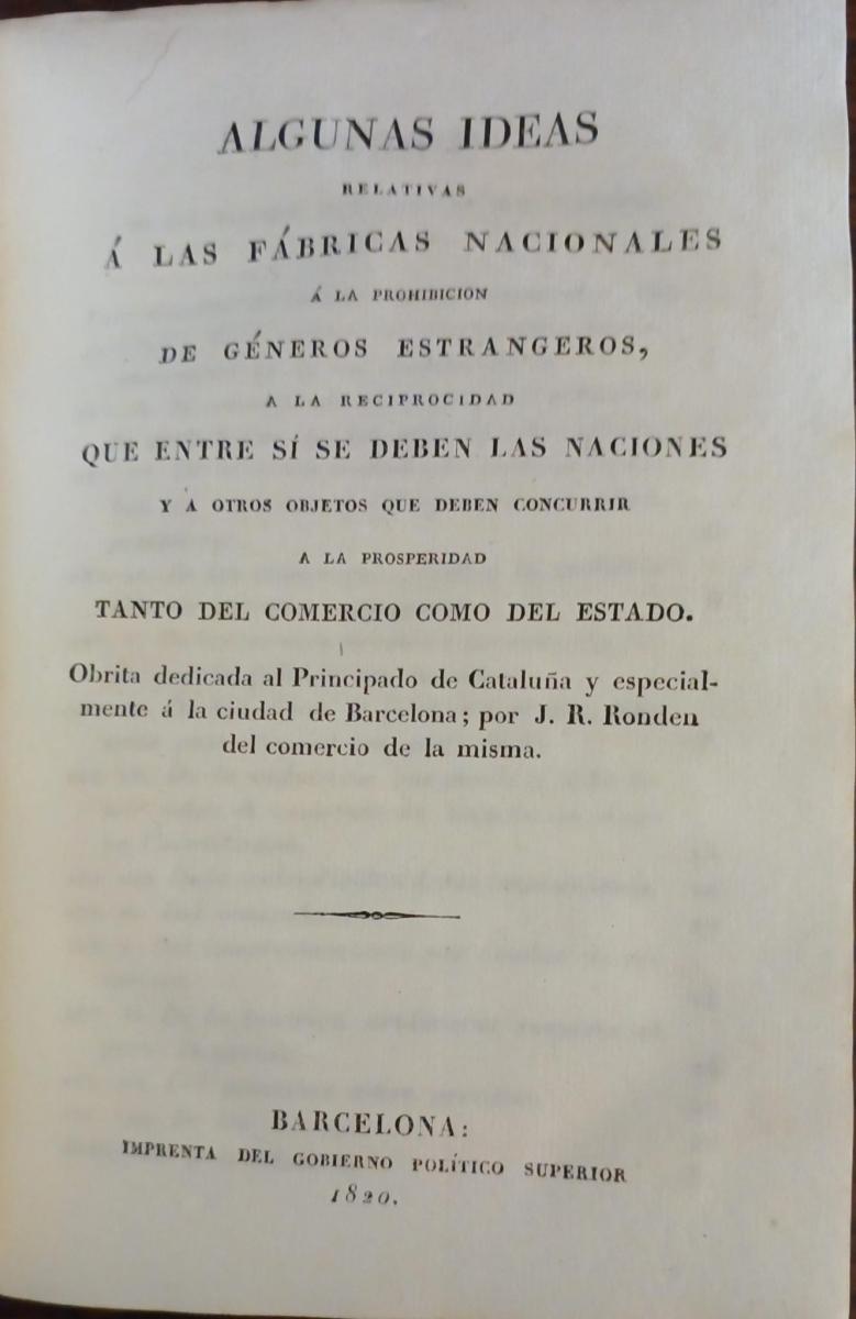 Discurso pronunciado por Juan de Balle diputado en Cortes por Cataluña Joaquín Jordi, 1821 - Algunas ideas relativas a las fábricas nacionales a la prohibición de géneros estrangeros a la reciprocidad que entre sí se deben las naciones prosperidad tanto del comercio como del estado, por J. R. Rondeu.Imprenta Gobierno Político, 1820, 35 págs. - La necesidad del sistema prohibitivo en España. Diálogo entre un comerciante inglés y otro francés sobre el que se ha publicado en cádiz entre los españoles Canuto Contreras y Prudencio Razones de Cádiz. Barcelona, José Torner, 1822 - Relación médico-política sobre la aparición de la fiebre amarilla en 1821 en las tripulaciones de los buques del puerto de Barcelona... por Juan Francisco Bahí. Juan Abadal, Mataró, 1821 - Dictamente acerca del origen, curso, propagacion contagiosa y estincion de la calentura amarilla que ha reinado en Barcelona en 1821... Viuda Antonio Brusi, Barcelona, 1822 - Breve noticia de las tareas y operaciones mas importantes de la Diputación Provincial de Cataluña entre 1820 y 1822, Imprenta del gobierno político, 1822, 78+LXXI págs. Pergamino, 15x20