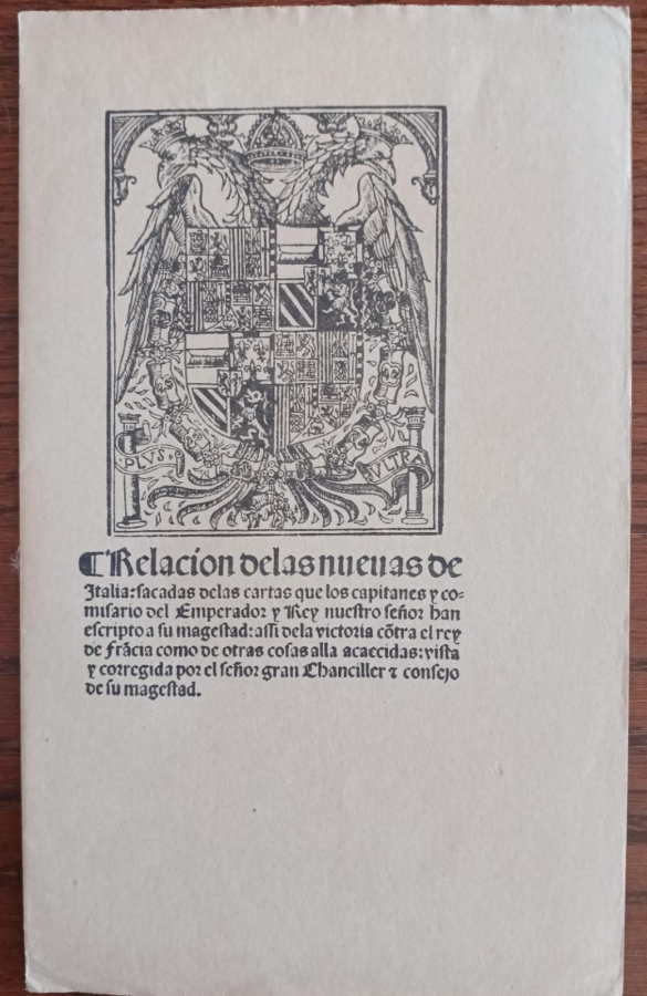 han escrito a su majestad: allí de la victoria contra el rey de Francia como de otras cosas alla acaecidas. Vista y corregida por el Sr. Gran Chanciller y consejo de su majestad. 16 páginas impresas con letra gótica, grabado en portada. Facsímil Sancho Ra