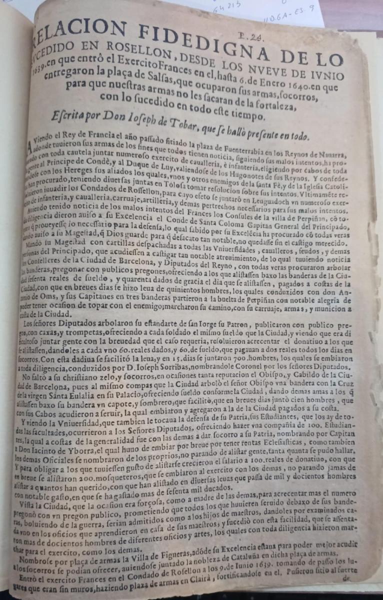 Relación fidedigna de lo sucedido en Rosellón, desde los nueve de junio 1639 en que entró el ejercito francés hasta el 6 de enero de 1640 en que entregaron la plaza de Salsas (Salses), que ocuparon sus armas, socorros, para que nuestras armas no les sacaran de la fortaleza con lo sucedido en todo este tiempo