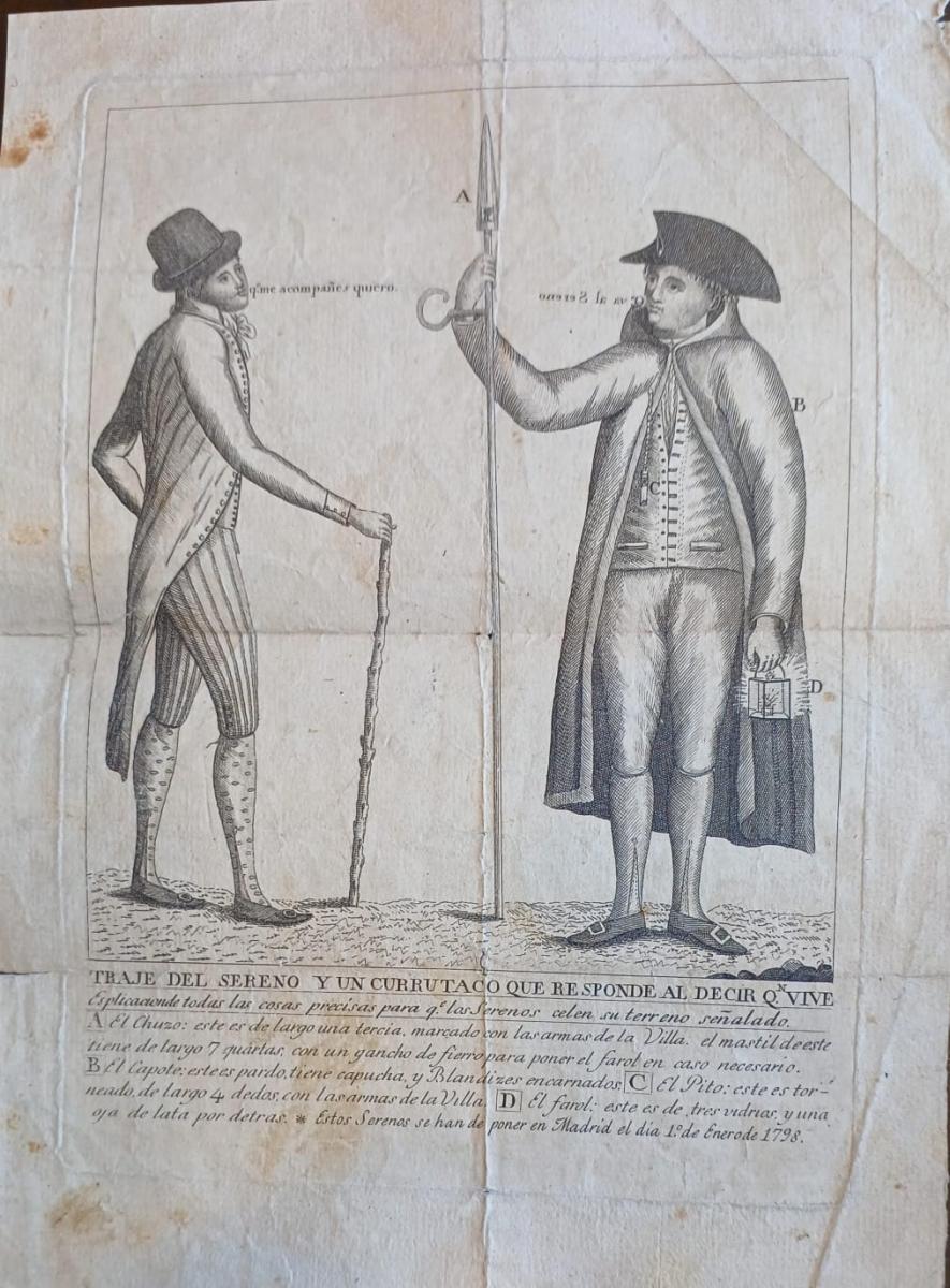 Traje del sereno y un currutaco que responde al decir que vive explicando todas las cosas precisas para que los serenos celen su terreno señalado...